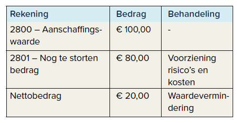 Een volgende topic betreft de verliesrisico’s verbonden aan het niet-opgevraagde gedeelte van aandelen waarop een onderneming heeft ingeschreven. In de boekhouding van de inschrijvende onderneming wordt enerzijds de aanschaffingswaarde opgenomen op rekening 2800 (€ 100,00), en anderzijds het nog te storten gedeelte opgenomen als creditsaldo op rekening 2801 (€ (80,00)). De balans vermeldt enkel het nettobedrag verkregen door samenvoeging van beide rekeningen. Het verliesrisico staat vast, de stortingsverbintenis is onvoorwaardelijk. De onderneming waarin is deelgenomen leidt vervolgens duurzame verliezen die meer bedragen dan haar totaal eigen vermogen m.i.v. het niet-gestorte gedeelte van het kapitaal, en de waarde van de deelneming keldert. Zoals verduidelijkt in het voorbeeld hieronder mag er in dit geval géén waardevermindering worden geboekt met betrekking tot het niet-gestort gedeelte van het kapitaal, anders zou er een negatief bedrag worden opgenomen voor een actiefbestanddeel op de balans. Er moet ten belope van dit bedrag een voorziening voor risico’s en kosten worden geboekt. Een waardevermindering is enkel mogelijk met betrekking tot het nettobedrag.